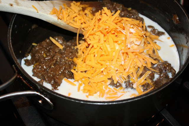 Remove from heat. Add milk and cheeses,